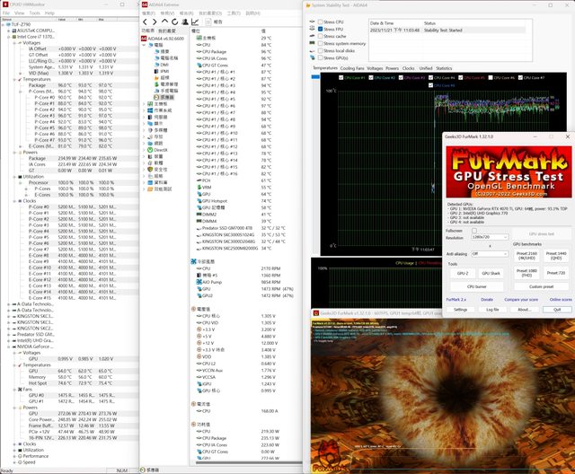 顯示卡溫度部分,雖然RTX4070Ti本來發熱就不算高,但雙烤時的溫度對比其他網站測試
