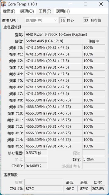 AVX重度負載約207W左右,時脈4.6-4.7G左右溫度約92度