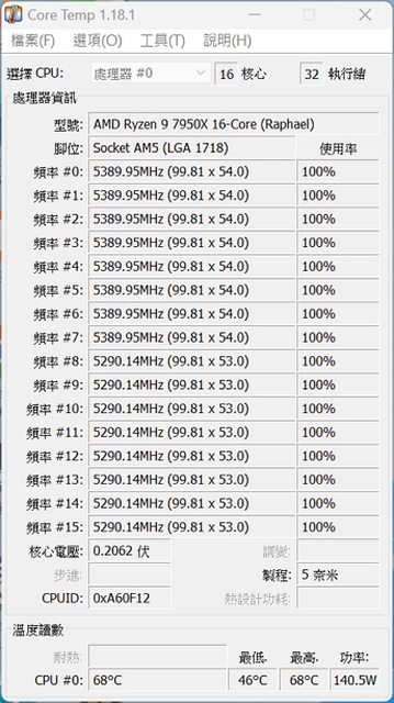 日常運算中度負載約68度功耗140W