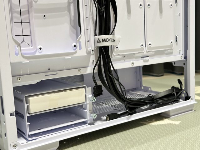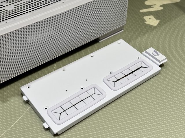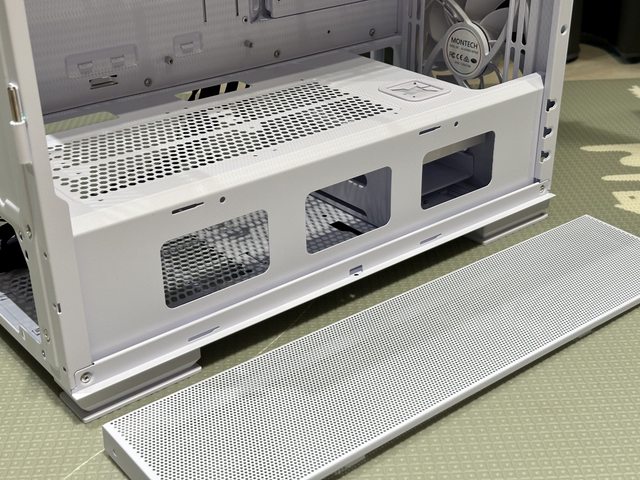 電源使用後抽式尼龍濾網,前方的底部硬碟架則可見具備前後兩段可調位置。