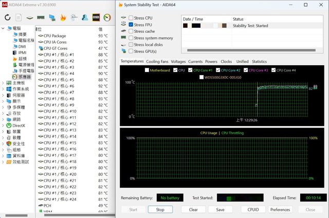 單烤FPU約10分鐘後測得CPU Package溫度為93度,P核心平均88.875度,此時冷排風扇為