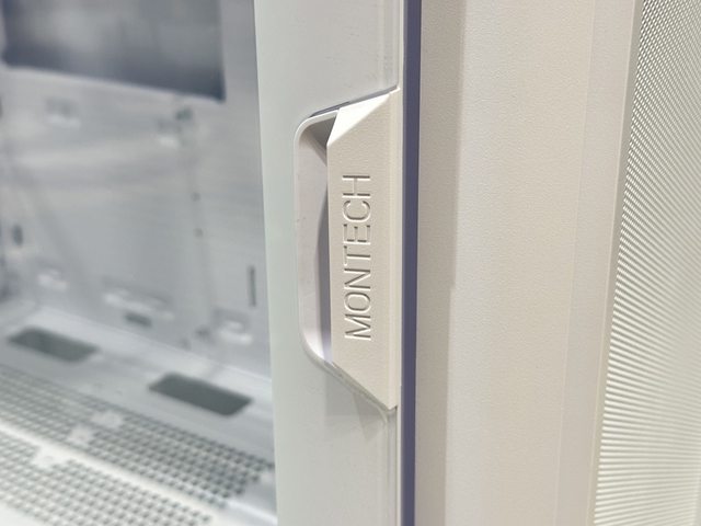 玻璃側板採用側拉式開門設計,前方以磁鐵吸附至機殼固定位置並提供開門把手,可將整