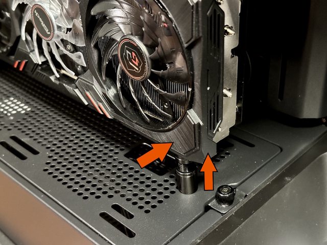 上支撐顯示卡外,藉由底部與機殼吸附的磁鐵及摩擦力還能提供一個向機殼方向的力矩,