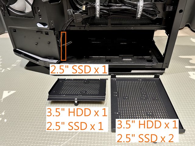 電源艙邊緣能安裝1顆2.5" SSD,其餘支架能安裝硬碟尺寸及數量可參考下方照片標示,