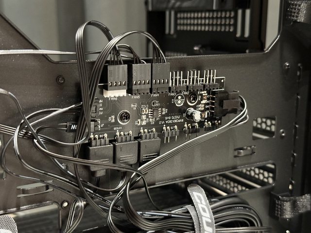 主機板背面硬碟架下方藏有6埠FAN及ARGB HUB,預附的3顆風扇則已先佔據其中3孔。