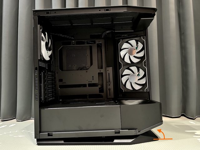 前方底部抬升的斜角進氣風扇為官方宣傳特色之一,除了可安裝風扇外亦可替換成展示平