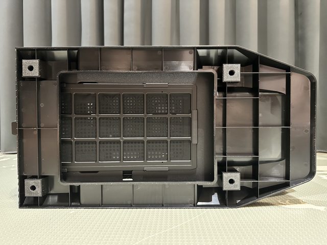 底部腳座為整片經結構強化的塑膠材質,底部濾網為尼龍材質,採用往機殼後方抽拉方式