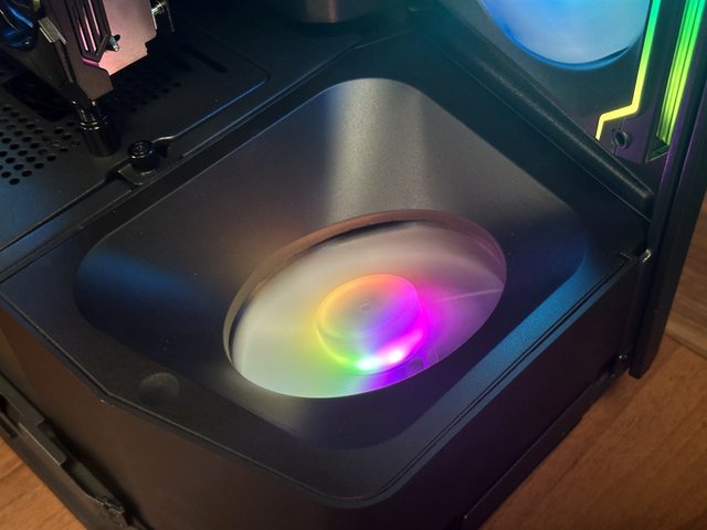 葉。前方底部設有一顆以傾斜角度安裝的12cm ARGB風扇,一樣作為進氣用途。機殼上方