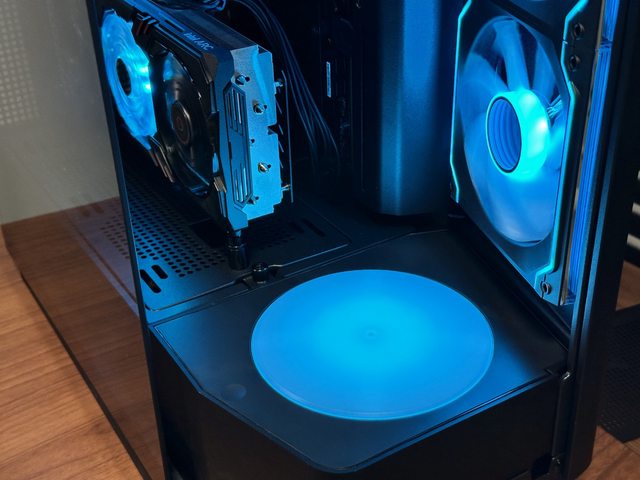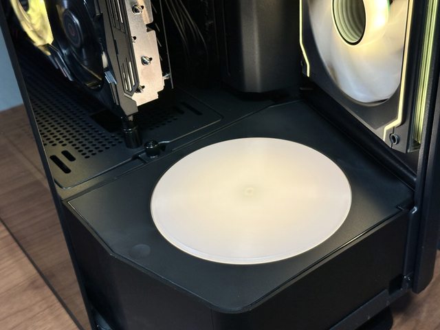 裝上機殼後的效果...旋轉平台一樣帶有ARGB燈效,依肉眼判斷應該有3顆LED燈珠。裝上