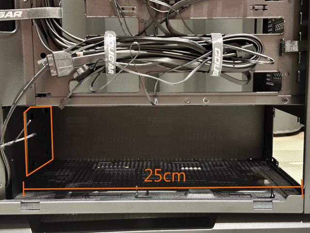 底部空間扣掉SSD後還有約25cm,雖然官方標示最高可支援電源長度也是25cm,但得留設