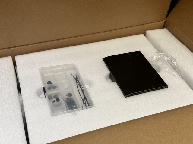 打開包裝能看到配件收納盒及裝有顯示卡直立支架底座的黑色紙盒。