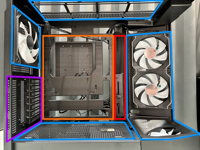 藍色為風扇安裝區,後方排氣風扇預裝1顆與進氣同款的積木風扇,差別僅在於為正向扇