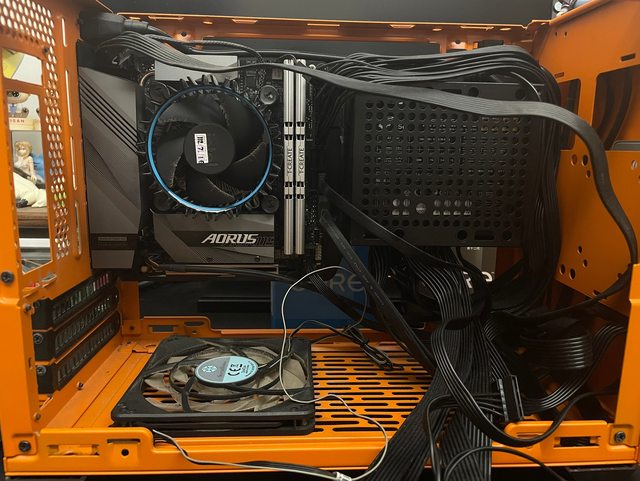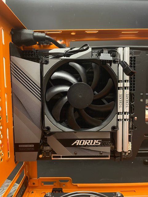 這顆沒辦法後進,他能裝風扇的位置只有上下, 前排好像能裝90還80的扇但我拿去掛PSU支架跟SSD了, 而且下壓是明顯的好整線,先這樣試試看, 真的不行就買新的散熱器(?)。