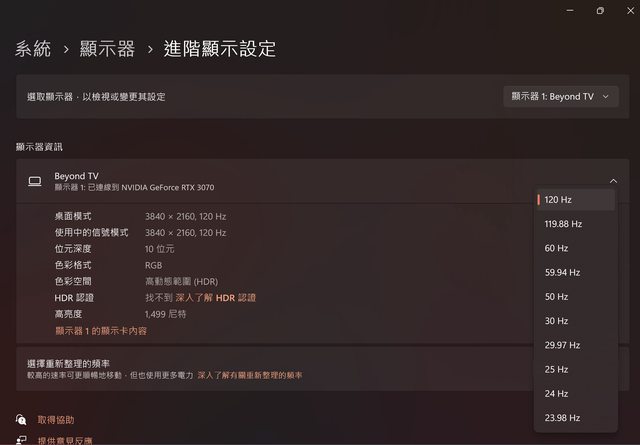 我和 Line 客服感謝,說我拿到我想要的回應資料了,可以不用安排後續到府 dump 電視 的診斷資料。 --- 使用 3070 輸出: 雖然 Nuc14 Pro 已經證明了能夠呈現完整的 RGB4:4:4 格式,以及 Mac 證明能夠 4K120Hz HDR,但我還想試更多,所以厚著臉皮請朋友拔了他的 3070 顯卡,跨縣市送到 我家測試。 結果一插上 3070 HDMI 輸出到 C755,甚麼都沒有調整,直接輸出了最全面最完整的 4K120Hz HDR RGB4:4:4 10bpc,真的是一點廢話都沒有,拍了拍照就苦笑著拔下了顯卡。 結論已明,C755 電視並不是瓶頸,瓶頸在各輸出設備上。 https://i.imgur.com/6j6EePI.jpg
