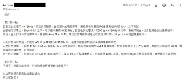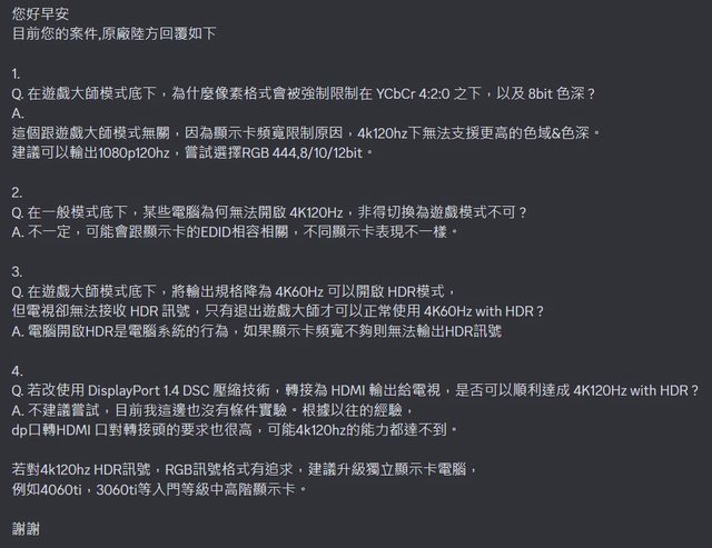 華擎的最後一封信,短短的表示到,"表格所列出的是在最佳狀態所表現的結果,X600 的 限制表現就是您目前測試的結果",隨後就終止一切後續問題的回應,沉默。 華擎這個回復法,我只能說,也算是側面示軟 X600 達不到聲稱 HDMI FRL 8G 的標示值 ,這可能是華擎不想正面回應 X600 詳細輸出規格最後的倔強吧......。 --- 與 TCL 客服聯繫: 我原本以為面對 TCL 客服會像之前面對 Panasonic 客服問電視那樣痛苦折磨(這又是另 一段"佳話了"),經過這次經驗,我覺得 TCL 客服經驗好太多了。 我寫了 E-mail 到 TCL 信箱文字描述了跟給華擎類似的內容,主要是問 4K120Hz HDR、 像素格式與色深規格的問題,但我似乎寄錯位置了,導致售後諮詢沒有接到我的 E-mail 。 隔了一天 6/18,改打電話給 TCL,是一個客服姊姊接的電話,一聽到聲音,我的刻板印 像就告訴我,"姊姊"可能對我接下來的詞語會沒概念,又要解釋斡旋很久,沒想到這位客 服姊姊對於影視相關用詞溝通非常順暢,作為前台的專業度是肯定的,只有到後續像素格 式的部分被考倒了,幫我配合我的時間約了當週週六 6/22 的到府檢測。 週六下午,一個 TCL 當地跑點的一線人員來,跟我當面了解狀況跟現場操作,但因為忘 記帶上 dump 診斷資料用的隨身碟,所以現場把過程都錄影起來帶回公司,也因為我的問 題比較複雜,他當場電話聯繫主管(應該是維修站的主管或站長?) 幫我後送問題到 TCL 對岸原廠技術人員那裏,並且和我說約兩三天會給我結果。 結果快,還要更快!週六下午離開,6/24 週一早上,TCL Line 客服把對岸針對我條列出 來的問題,每條清楚回復,並且還給出具體建議 (我超...跟華擎冰冷回復比起來,宛如 天地)。 https://i.imgur.com/emyJN2k.jpg