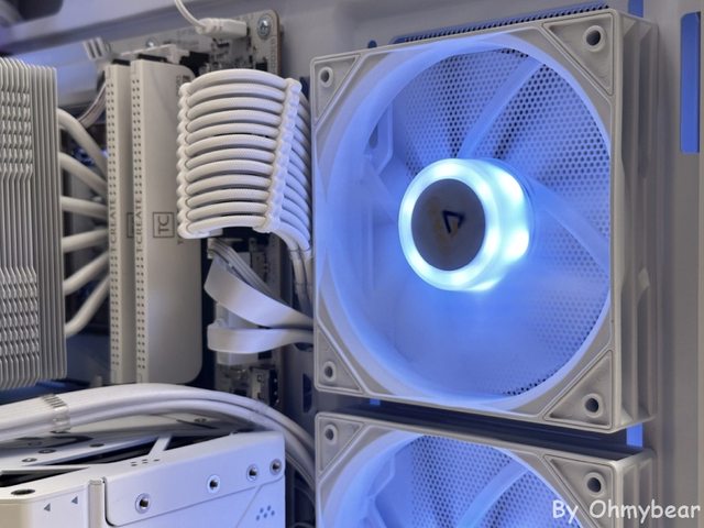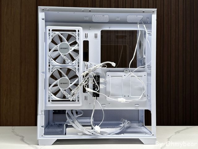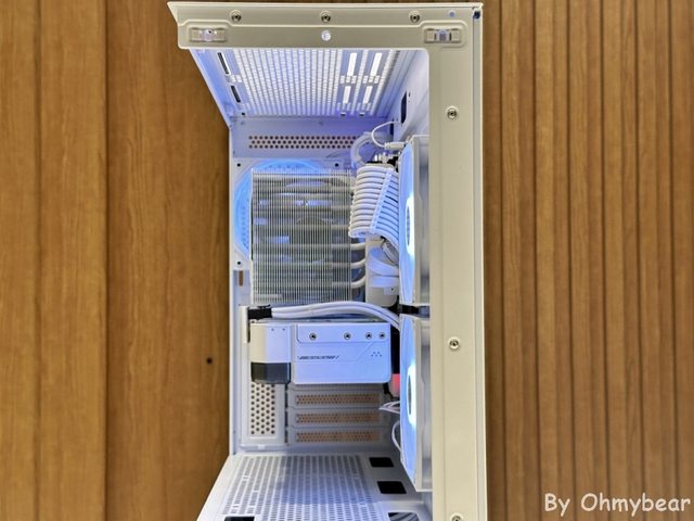 後方預裝一顆120mm正向扇葉風扇排風,頂部空間有稍微抬高,安裝厚冷排沒問題。