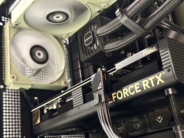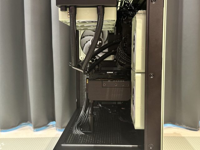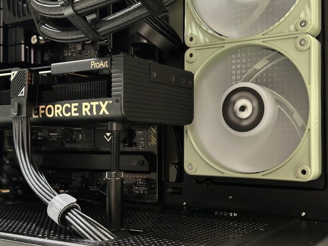 顯示卡剛好跨過側邊風扇,如側邊要搭配水冷只能使用雙風扇短卡,且建議側邊僅安裝