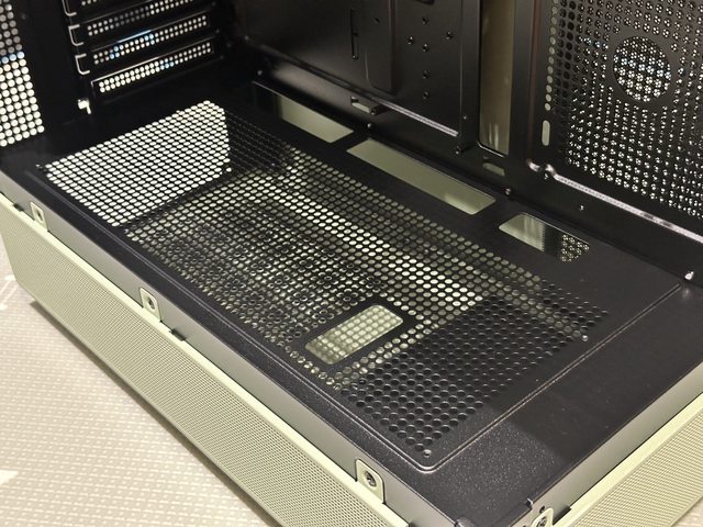 底部於電源倉位置配置小片PVC磁吸濾網,硬碟架有兩段可調空間。