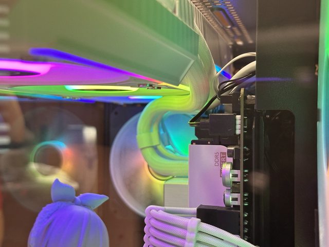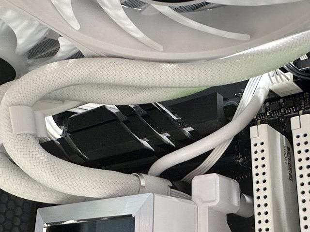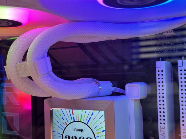 外露的可能,將風扇供電及RGB燈效同步需要的3Pin及4Pin線包裹在不同水冷管內且直接