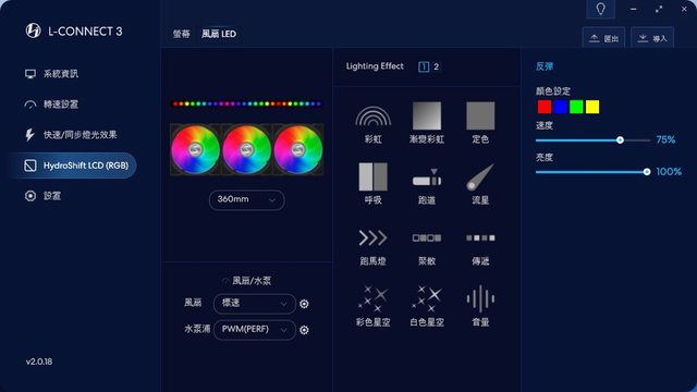在進入螢幕設定介紹前,先來點簡單點的,風扇LED頁面能調整Hydroshift LCD 360R上3