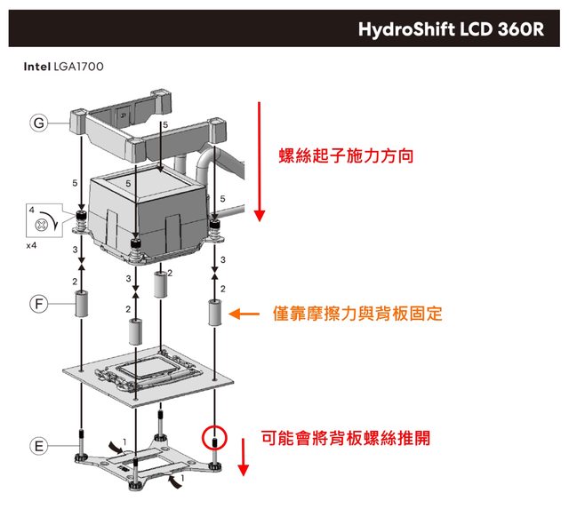 但個人經實際安裝後覺得INTEL陣營扣具設計有待改進,這裡用官方說明書的圖示來簡單