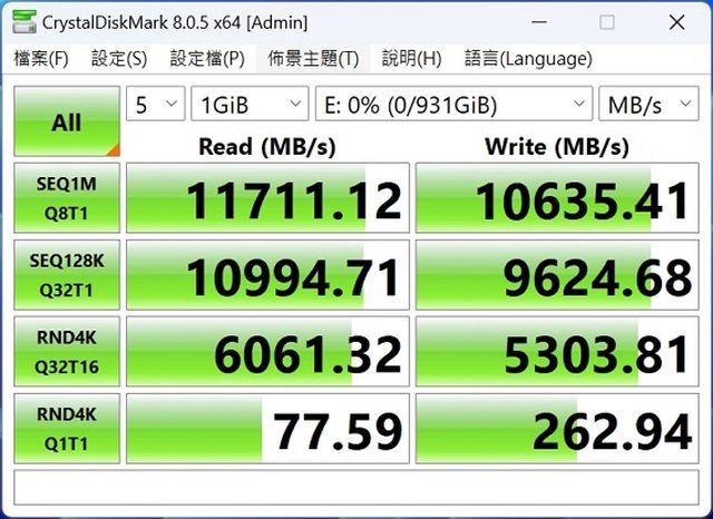 Crystal DiskMark 讀取11711MB/s寫入10635MB/s跟官方標示差不多