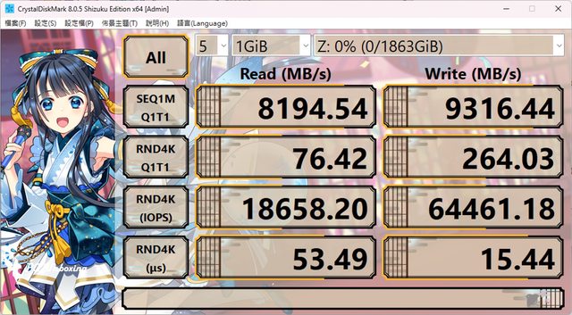 2TB 的讀取寫入性能,在 NVMe SSD 設定模式下測試檔案容量設置為 1GiB,在預設設定