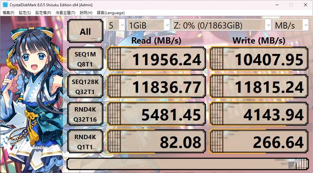 檔所測得的連續讀寫速度為 11956 MB/s 以及 10407 MB/s。