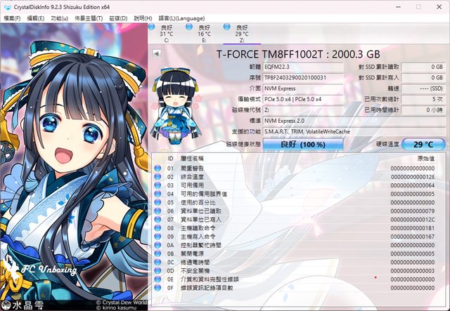首先透過 CrystalDiskInfo 軟體來檢視 T-FORCE Z540 M.2 PCIe Gen5 x4 SSD 2TB 的基