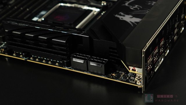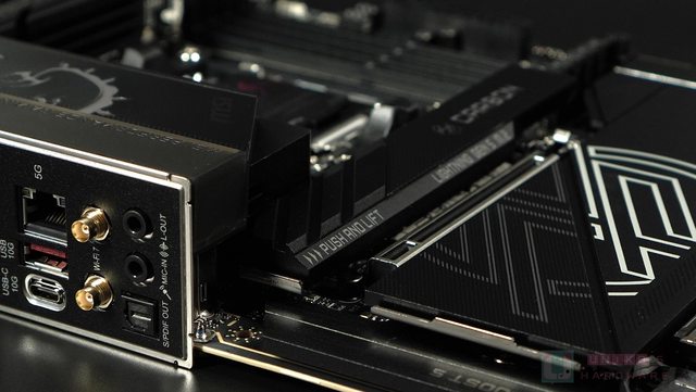 CARBON CPU 供電散熱器上的 CARBON 碳纖裝飾有當年 MSI CARBON 的跑車風,加上 I/O 裝