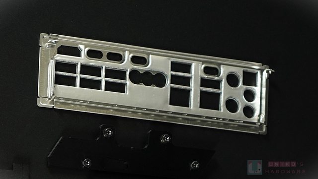 細看左上區塊是 I/O 裝甲 (塑膠) 和 CPU 供電散熱器,裝甲遮掩部份金屬散熱器的表面,