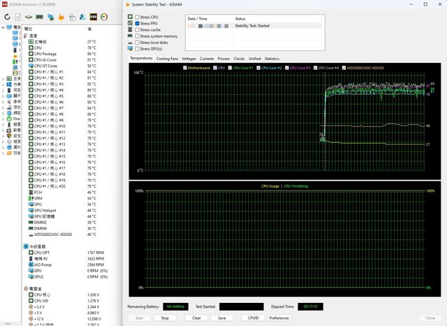 經單烤FPU13分鐘後,測得Package溫度約89度,P核心平均約86度,風扇轉速約1767rpm,