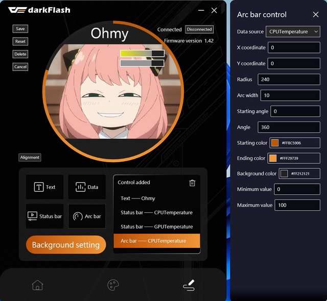 狀態條、弧形狀態條一樣可自訂顏色及位置,能以條狀顯示溫度等資訊,如果需要數字顯