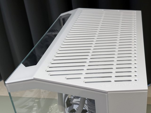 上方玻璃側板雖然尺寸較小,但帶有彎折的設計能提高視覺通透感。搭配長條狀開孔頂蓋