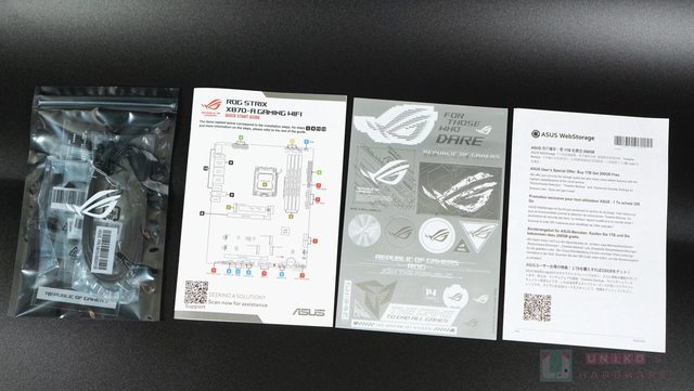 配件包含一份彩色快速指南、白色系主機板專有的 ROG 信仰貼紙,以及一份關於 ASUS WEB