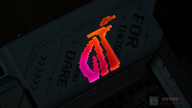 透光的 ROG 像素造型 LOGO,一旁點綴小小的造型紀錄點與線條,以及 REPUBLIC OF GAMER