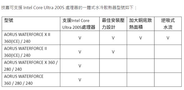 技嘉可支援 Intel Core Ultra 200S 處理器的一體式水冷散熱器型號如下: