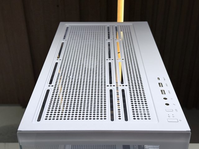 IO位於頂蓋,常見的2A1C及雙3.5mm音訊孔配置,開關則提供開機鍵及燈效切換鍵,視需
