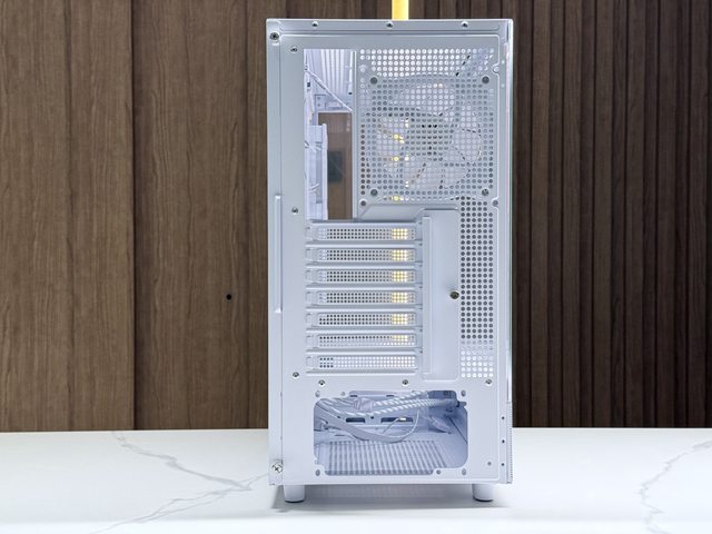 採用小尺寸中塔機殼常見的單艙+電源下置+後120mm風扇排風設計。
