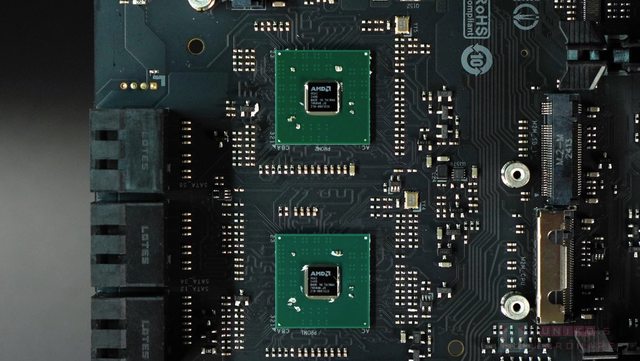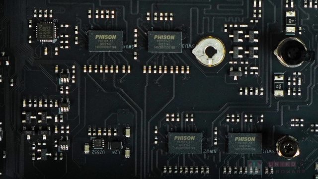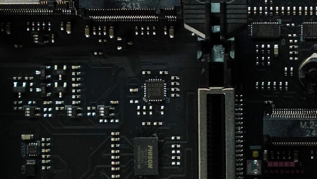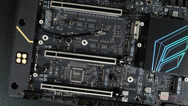 ‧ 兩組 GEN5 PCI-E 插槽之間,共有 4 顆 PHISON PS7101 GEN5X2 通道切換器,一同負責