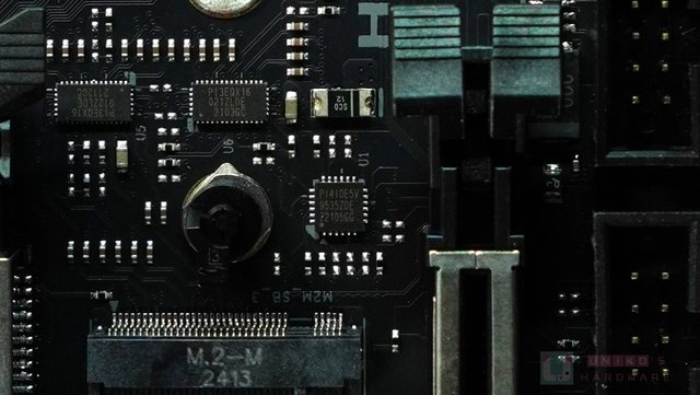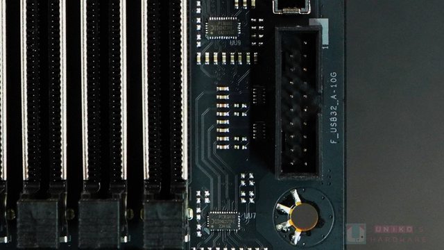 ‧ 前置 USB 10 Gbps 19-PIN 旁邊有 1 顆 DIODES PI3EQX1004E DUAL 10 Gbps USB REDRI