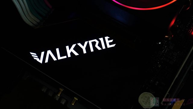 供電散熱器上的背景不再是鏡面後,只要使用者點亮 RGB 燈效,VALKYRIE 字樣看起來反而