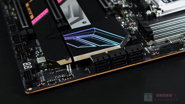 來到正面下半部,基本上被金屬的音效裝甲、M.2 散熱器、以及南橋散熱器覆蓋,第一眼就