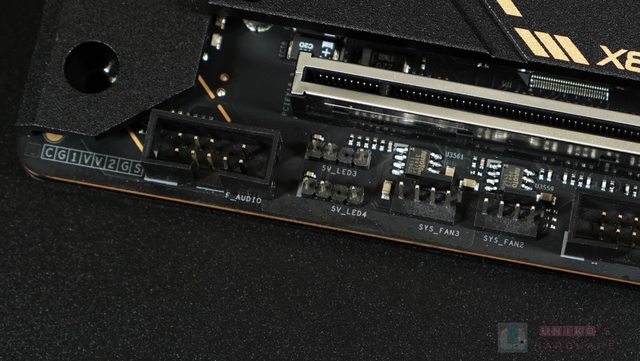 2 散熱器左方,承接上半部金色斜切面,繼續往右看至南橋散熱側邊,就能看到與之呼應的