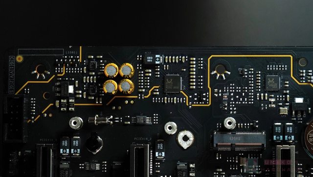 器的金色線條,其尾端還標有 X870E 的文字,一塊亮面小小的金色裝飾,則位於第一個 M.