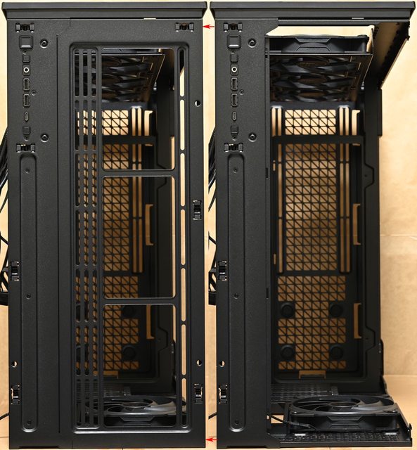 ○前方/頂部/電源艙隔板/底部/後方可裝最多12個風扇,前方/頂部可裝420mm水冷排(擇