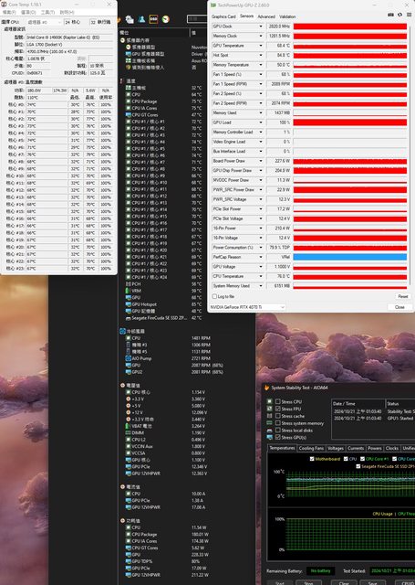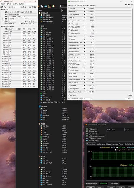 ▼CPU+GPU高負載30分鐘後Core Temp、GPU-Z感測器、AIDA64感測器頁面