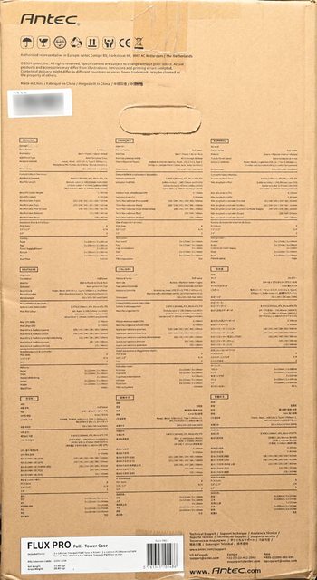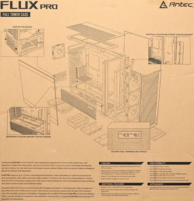 ▼此面外箱有ANTEC商標、FLUX PRO標誌、分解爆炸圖/重點特色單線圖、特色說明