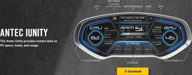 ▼ANTEC iUnity軟體畫面,顯示主機板型號、CPU使用百分比/型號/溫度/時脈、記憶體使