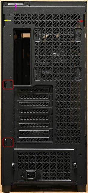 ▼後方最上面有打開左側板(紅色箭頭)、頂部網孔板(紫色箭頭)及右側板(黃色箭頭)的施